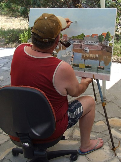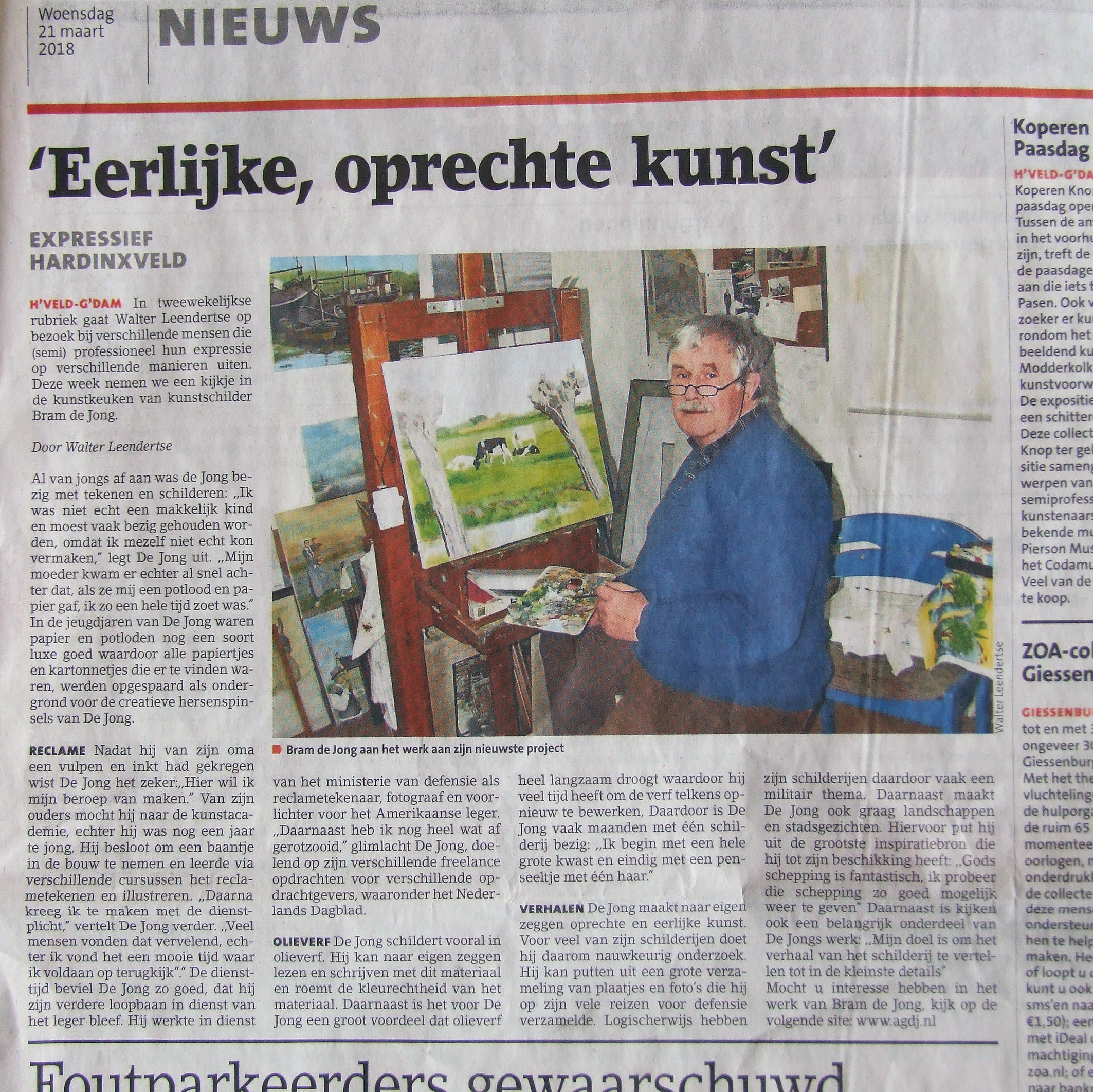 Bram de Jong, kunstschilder (agdj)Op 17-jarige leeftijd begon ik als werktekenaar op een reclamebureau in Rotterdam. Daarna vervulde ik m’n dienstplicht bij het Korps Mariniers en was vervolgens werkzaam als Public Affairs Officer (PAO-communicatie) bij de overheid. Artikelen schrijven, fotograferen, grafisch ontwerpen, het redigeren van een tweetal bladen enz. In 2013 nam ik afscheid als hoofd voorlichting bij een Amerikaanse Transport Brigade. In deze laatste functie zag ik heel wat van de wereld en bewonderde kunst in musea in vele landen. Al ruim 40 jaar houd ik me actief bezig als kunstschilder. Op dit moment werk ik full time als kunstschilder. Ik ben autodidact, een ‘zelfstudie kunstschilder’. Met veel kijken, zien, praktijk, en veel lezen verwierf ik mijn kennis over de schilderkunst! Ik nam ook deel aan een Masterclass van Els Vink; ‘Schilderen als de oude Meesters. | |